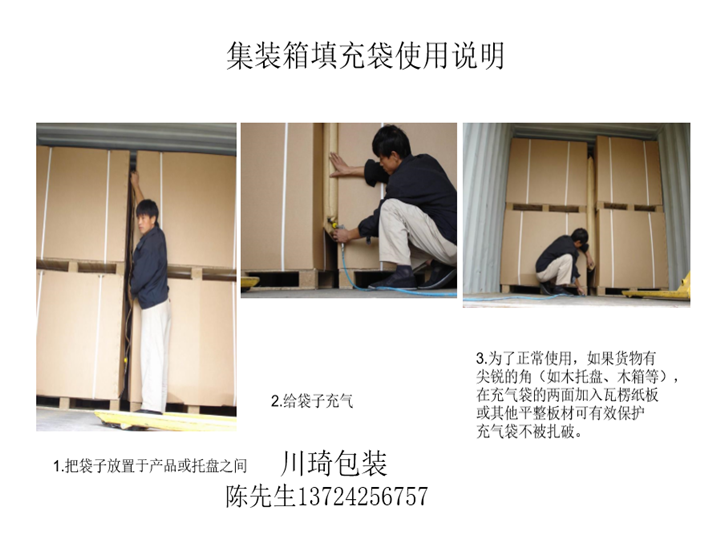 运输中发生货损最普遍的因素是:运输过程中来自前后或左右的货物之间的碰撞而造成包装破损。集装箱充气袋具有单向逆止气阀、安全不漏气、放气迅捷、密闭牢固、可承受七吨以上的压力,广泛应用于集装箱、海运、拖车、火车等各种运输方式中;填充货物之间的空隙,协助固定位置,支撑货物因摇晃而产生的重量,吸收震动,保护运输途中的货物,避免移动和相互碰撞,起到缓冲,防倒塌等作用使货物安全无损;特别适用于托盘、整板、成批集装箱化运输的货物。也作为特殊货物在集装箱内定位使用。充气袋使用方便、快捷,可大大节约装箱时间,提高装卸速度、效率,降低运输成本,可以重复使用,更是国际货物运输中原木或发泡胶的新型环保替代产品,已经是国际上越来越普遍采用的集装箱填充方式。产品符合出口欧美国家环保标准。