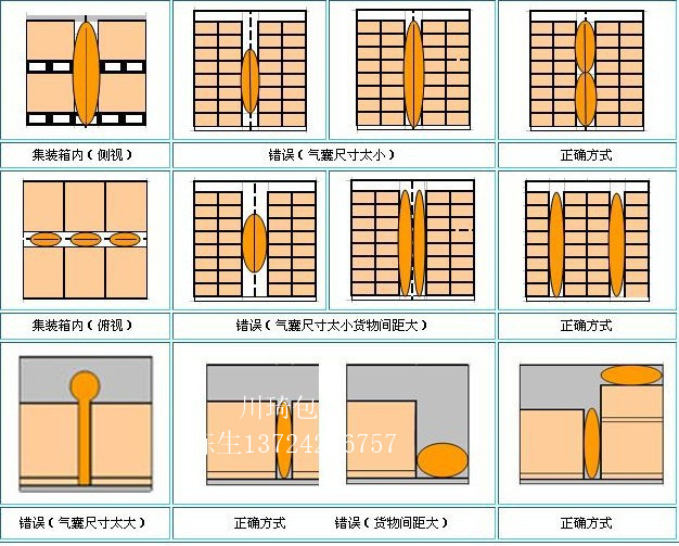 运输中发生货损最普遍的因素是:运输过程中来自前后或左右的货物之间的碰撞而造成包装破损。集装箱充气袋具有单向逆止气阀、安全不漏气、放气迅捷、密闭牢固、可承受七吨以上的压力,广泛应用于集装箱、海运、拖车、火车等各种运输方式中;填充货物之间的空隙,协助固定位置,支撑货物因摇晃而产生的重量,吸收震动,保护运输途中的货物,避免移动和相互碰撞,起到缓冲,防倒塌等作用使货物安全无损;特别适用于托盘、整板、成批集装箱化运输的货物。也作为特殊货物在集装箱内定位使用。充气袋使用方便、快捷,可大大节约装箱时间,提高装卸速度、效率,降低运输成本,可以重复使用,更是国际货物运输中原木或发泡胶的新型环保替代产品,已经是国际上越来越普遍采用的集装箱填充方式。产品符合出口欧美国家环保标准。