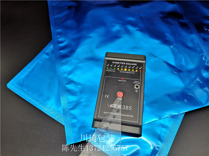 防静电铝箔袋具有防静电,防电磁干扰,防潮三大功能,法拉第电笼构造,屏蔽阻隔平均可达60db,静电保护功能强大,内层为纯金属铝构成,电阻率低于0.1Ω,四层结构复合能力强,封口牢固,具有良好的防水,阻氧,避光,耐穿刺,该产品适用于有防潮要求的电子产品包装:各类PC板,IC集成电路,光驱,硬盘,以及化学原料和生物中间体的真空包装等,表面电阻值108-1010Ω。
